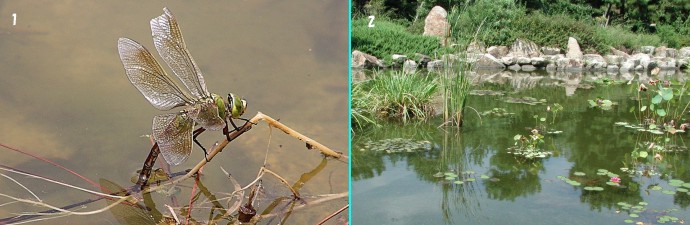2003/8/27に自宅近くの公園の池(兵庫県芦屋市)で水中に倒れたイネ科植物の茎にギンヤンマが産卵していたので,その茎を持ち帰り,調べてみると,産卵直後の卵と同時に,それ以前に産卵した卵があり,その1つに,卵寄生蜂の幼虫が入っていました.8月30日に幼虫が卵から出てきました.この卵寄生蜂は卵から出て,蛹化するようです.この幼虫は9月2日に蛹化し,9月6日に羽化しました. 図6-1 1.ギンヤンマの産卵 連結して産卵しているのをよく見かけますが,単独でも産卵します. 2.ギンヤンマの生息環境 幼虫は水生植物が適度にある,開けた水面のある池や緩やかな流れの川などに生息しています.