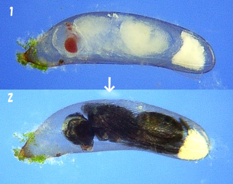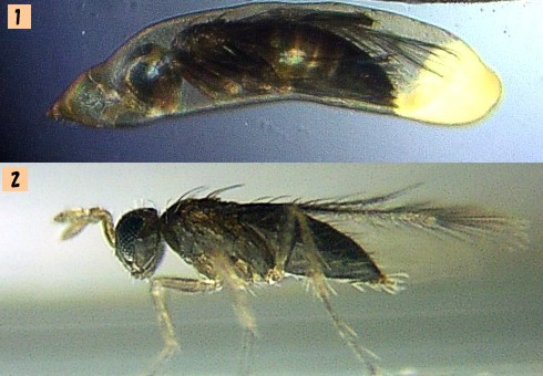 図13-5 タマゴヤドリコバチ科の卵寄生蜂 1:蛹 2:成虫 この個体の大きさは0.55mmです. (この図は図13-4の2倍に拡大してあります.)