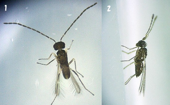 図13-4 ホソバネヤドリコバチ科の成虫 1:♂ この♂の体長は0.54mmです.♂は体長よりはるかに長い触角を持っています. 2:♀ この♀の体長は0.54mmです.♀は体長より少し短い触角を持っています.