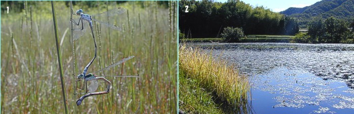 近畿地方に生息するアオイトトンボ属はアオイトトンボ,オオアオイトトンボ,コバネアオイトトンボです.アオイトトンボ,コバネアオイトトンボは生息環境,産卵場所が似ており,共通の卵寄生蜂もいるようです.オオアオイトトンボは産卵場所が異なるためか,卵寄生蜂も違うようです . このページの拡大率はすべて同じ(卵のページとも)です.(図1-6のみ拡大率は2倍です) 図1-1 :1.産卵中のアオイトトンボ 2.アオイトトンボの生息環境