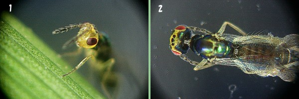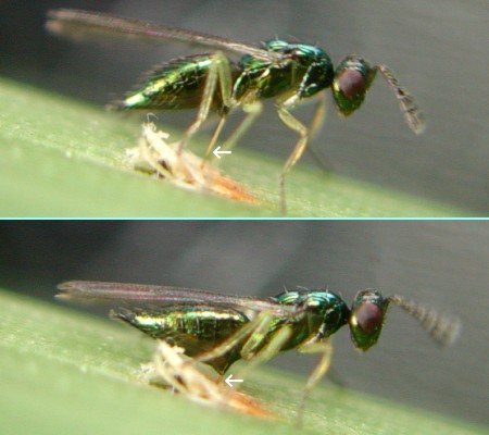 図1-2 : アオイトトンボとコバネアオイトトンボに寄生していた卵寄生蜂 アオイトトンボに寄生する卵寄生蜂で,広く分布しているようです.滋賀県で採集した植物からも,兵庫県から採集した植物からも出てきました.写真の寄生蜂はコバネアオイトトンボの卵に寄生していた卵寄生蜂です.腹部の下側から,植物の産卵痕方向に伸びているのが,産卵管です.植物はサンカクイでこの植物の中には,アオイトトンボの卵があります.下の写真は産卵管を腹部で押し付けるようにしながら最も深く産卵管を差し込んだところで,このときに産卵するようです.触角で植物の内部を探るように動かしながら植物の表面を歩き回り,産卵痕付近で産卵動作をすることが多いのですが,写真の蜂はちょうど産卵痕のところで,産卵動作をしています.この♀の大きさは体長1.20mm,触角の長さ0.35mmです.