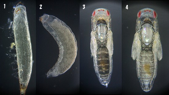 図1-4 :この卵寄生蜂はコバネアオイトトンボから出たものですが,生息環境がよく似ているアオイトトンボにも寄生します.空気中だけでなく,水中や水面でも羽化します.1.コバネアオイトトンボの卵の中の卵寄生蜂の幼虫.2.卵の外に出た幼虫. 3.蛹♂ 4.蛹♀