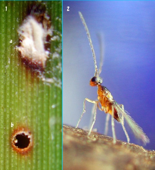 図1-7 : 1.卵寄生蜂の幼虫は卵の中で成長した後,蛹化前に卵を食い破って、卵の外に出て,植物組織の適当な隙間で蛹になります.成虫はトンボの産卵痕からではなく,自分で別に穴をあけて出てきます.図中のaはアオイトトンボの産卵痕です.bはらん寄生蜂が出てきた穴です.2.アオイトトンボに寄生していた別の卵寄生蜂♂ アオイトトンボからは上に書いた種とは別のやや小さい色の違う卵寄生蜂も出てきました.この寄生蜂の大きさは♀で体長0.80mm,触角の長さ0.65mmです.♂は♀に比べてより長い触角を持っています.