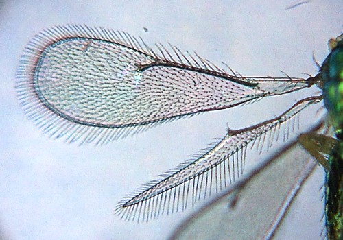 図1-6 :卵寄生蜂の翅(大きいほうが前翅,小さいほうが後翅)この写真は他の写真の2倍に拡大してあります.