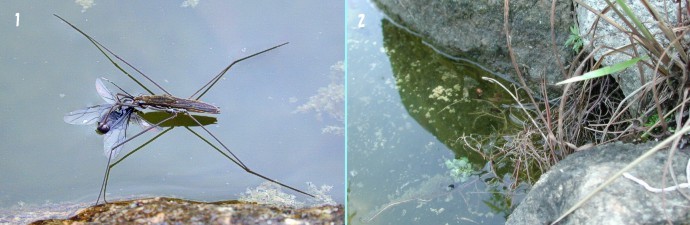 図7-1:1.アメンボ 2.アメンボの卵が見つかるところ