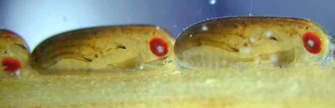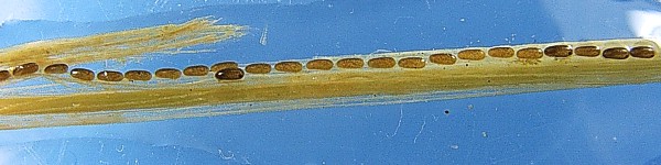 図7-2:アメンボの卵 トンボの産卵植物を探していると,よくアメンボの卵に出会います.植物表面に付着しているので,すぐ見つかります.コシアキトンボは植物表面に産卵しますが,それを持ち帰って見ると,アメンボの卵がついていることがよくあります.写真の卵は水面に伸びた植物の根に 付着していたアメンボの卵です.この根に産卵していたアオモンイトトンボの卵を観察するために持ち帰ったものです.写真の中で黒っぽいものが,卵寄生蜂が入っている卵です.