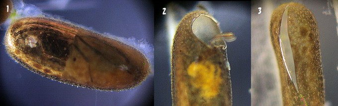 図7-4:1.卵寄生蜂が寄生したアメンボの卵 卵寄生蜂が寄生した卵は黒っぽくなり,中が不透明で見えにくいですが,卵寄生蜂が羽化してくる前には卵の約半分がやや透明になり,内部に蜂が見えてきます.2.卵寄生蜂が出た穴 卵寄生蜂は卵の殻を噛み切って出てくるので,丸い穴があきます.3.アメンボの幼虫がでた穴 縦長の割れ目のあるのはアメンボの幼虫が出た穴です.