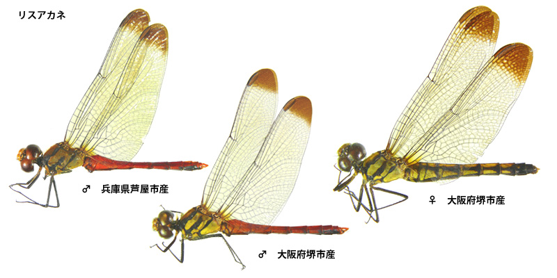 | トンボ科 リスアカネ Sympetrum risi risi Bartenef 体長約35mm〜47mm.羽化殻の大きさ約14mm〜20mm.翅の先が黒褐色アカトンボです.幼虫は丘陵地や産地の木陰の多い池に生息しています. 近畿地方の成虫出現期は6月上旬から11月下旬です.9月,10月に多く見られます. 卵期20日〜77日. 幼虫期最短108日. 1年1世代型. 現況:近畿地方では全域に広く分布しており,普通に見ることができます. |