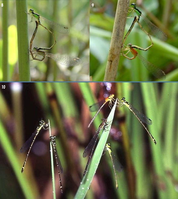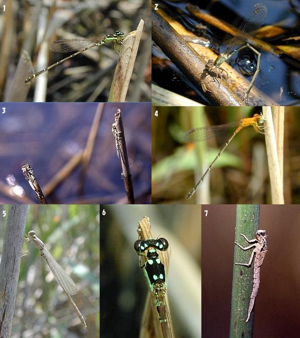 トンボSシリーズNo1 ヒヌマイトトンボ ヒヌマイトトンボ トンボSシリーズは近畿地方に生息するトンボの成虫,羽化殻,卵を紹介するシリーズです. 芦屋市には生息していません. 絶滅のおそれのある野生生物の種のリストで,絶滅危惧T類になっているトンボです.兵庫県北部,京都府北部の産地では今のところまだ見られますが,生息域が汽水域のアシ(ヨシ)原であり,生息範囲もあまり広くないので,埋め立てや護岸工事などで生息地がなくなってしまうことも考えられます.写真1〜10はどれも兵庫県北部,京都府北部で撮影したものです. 1:♂ 2:産卵中の♀ 3:羽化殻 4:小さな昆虫を捕食する若い♀ 5:羽化直後の♂ 6:♂の頭部,胸部背面の斑紋 7:羽化殻 8:交尾(♀は成熟) 9:交尾(♀がやや若い) 10:集団で夜をすごす成虫(夜間に撮影) 交尾は午前中に行いますが,モートンイトトンボのような早朝ではありません.交尾後♀は単独で,倒れてやわらかくなったアシ(ヨシ)の茎などに産卵します.産地では羽化直後の個体から成熟した個体が同じ場所で見られます.