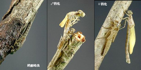 飼育幼虫の羽化 左:幼虫を飼育しているとよく水中からでて,何時間も水面の方向を向いていることがあります. 中央:♂の羽化 右:♀の羽化 羽化後しばらくは白っぽい色をしています.