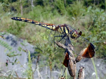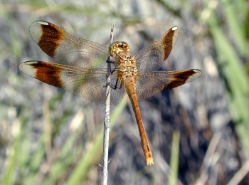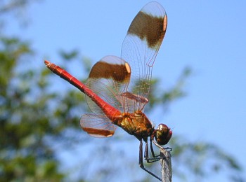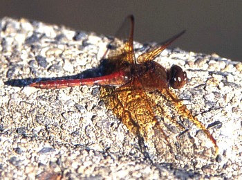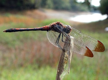 成虫の大きさ4.0cmから4.5cm.羽化殻の大きさ1.6cmから2.0cm.翅の基部に広い橙赤色の部分があるアカトンボです.7月から10月下旬まで見られます.近畿地方では全域に広く分布しています. 写真