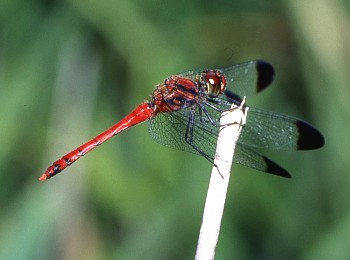 成虫の大きさ3.3cmから4.3cm.羽化殻の大きさ1.4cmから1.9cm.翅の先が黒褐色アカトンボ.7月から11月上旬まで見られます.幼虫は丘陵地や産地の木陰の多い池に生息しています.近畿地方では全域に広く分布しています.写真