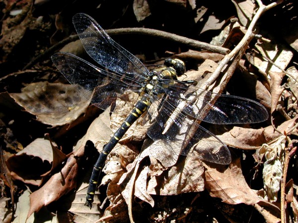 成虫の大きさ約6.5cmから7.2cm.羽化殻の大きさ約3.5cm.動きがゆるやかでよく日当りのよい場所に とまっています.他のトンボにはあまり見られない体色、斑紋をしています. 近畿地方で観察できる期間5月から7月まで.幼虫は低山地の水がしみ出すような湿った斜面や,コケの下などに穴を掘ってすんでいます.近畿地方では全域に分布していますが,数はあまり多くありません.生息地も減っています. 写真:♂ (2001年5月 京都府久美浜町)