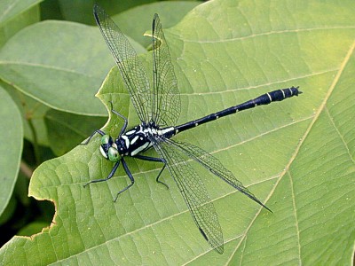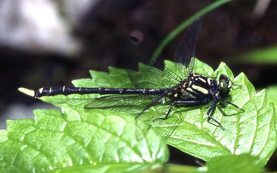 Davidius nanus (Selys) 成虫の大きさ4.2cmから4.9cm.羽化殻1.9cmから2.1cm.清流の上流域から中流域にすむ小型のサナエトンボです.4月中旬から7月上旬まで見られます.写真:葉上で静止する♂ (2002年5月 兵庫県安富町)