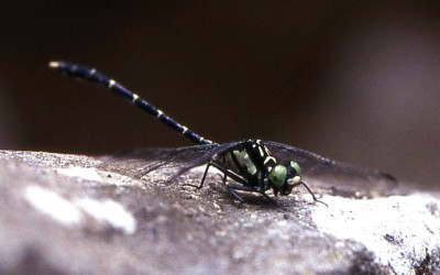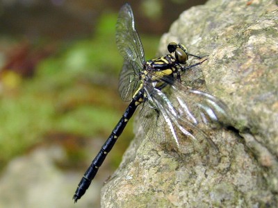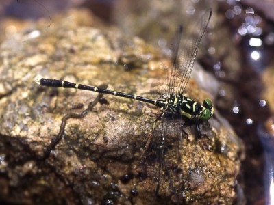 Stylogomphus suzukii (Oguma) 成虫の大きさ3.9cmから4.3cm.羽化殻1.7cmから2.2cm.小型のサナエトンボです.近畿地方では6月から8月下旬まで見られます.幼虫は山間の渓流や細流から河川の中流域で見られます.写真:渓流の石の上で縄張り中の♂ (8月 兵庫県芦屋市)