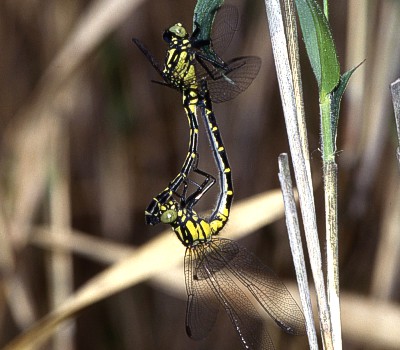 Trigomphus interruptus (Selys) 成虫の大きさ4.3cmから4.8cm.羽化殻2.4cmから2.7cm.幼虫は水生植物の多い池や沼などに生息します.近畿地方ではタベサナエより少し遅く現れる小型のサナエトンボです.最近は都市近郊からだんだん減っているようです.4月中旬から6月下旬まで見られます.写真:交尾 (4月 兵庫県加西市)