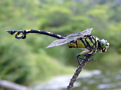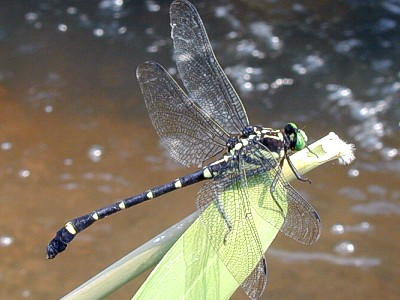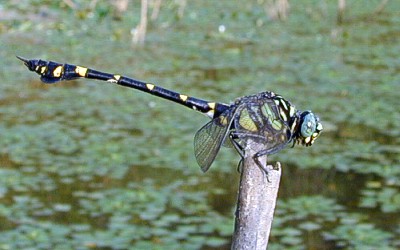 Ictinogomphus pertinax (Selys) 成虫の大きさ7.3cmから7.6cm.羽化殻約3.0cm.ウチワヤンマに似ていますが,やや小さく,腹部第8節のうちわ状の広がりが小さいので,ウチワヤンマと見分けられます.この種類は分布を北に広げている種類です.近畿地方では7月と8月に記録が多いようです. 最近では数も多くなっています.写真:水面から出た 枝の上で縄張り中の♂ (2000月8月 兵庫県神戸市) |