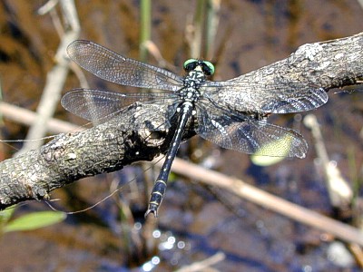 成虫の大きさ3.7cmから4.3cm.羽化殻の大きさ2.2cmから2.4cm.小型のサナエトンボです.近畿地方では主として日本海側で4月下旬から6月末まで見られます.幼虫は池,沼,湿地に生息しています.写真:枯れ木に静止する♂ (2001年5月 京都府久美浜町)