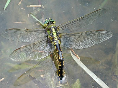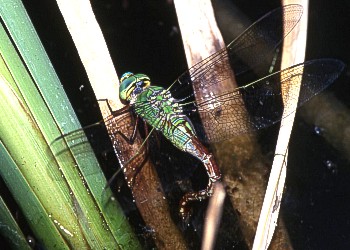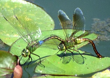 Aeshna nigroflava Martin 成虫の大きさ7.9cmから9.3cm.羽化殻の大きさ4.4cmから5.4cm.黒褐色の地色に青色から黄緑色の斑紋のある大型のヤンマ.ルリボシヤンマより青色味が強く少し大きいヤンマです.8月上旬から9月下旬まで見られます.ルリボシヤンマより標高の低いところで見られます.写真:産卵(2000年8月 兵庫県神戸市)