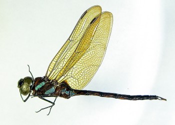 Boyeria maclachlani (Selys) 成虫の大きさ8.0cmから8.6cm.羽化殻の大きさ約4.5cm.日の出ころ,日没後のたそがれ時に活動する大型のヤンマです.近畿地方では7月上旬から9月中旬まで見られます.写真:羽化直後の♀(7月 兵庫県社町)